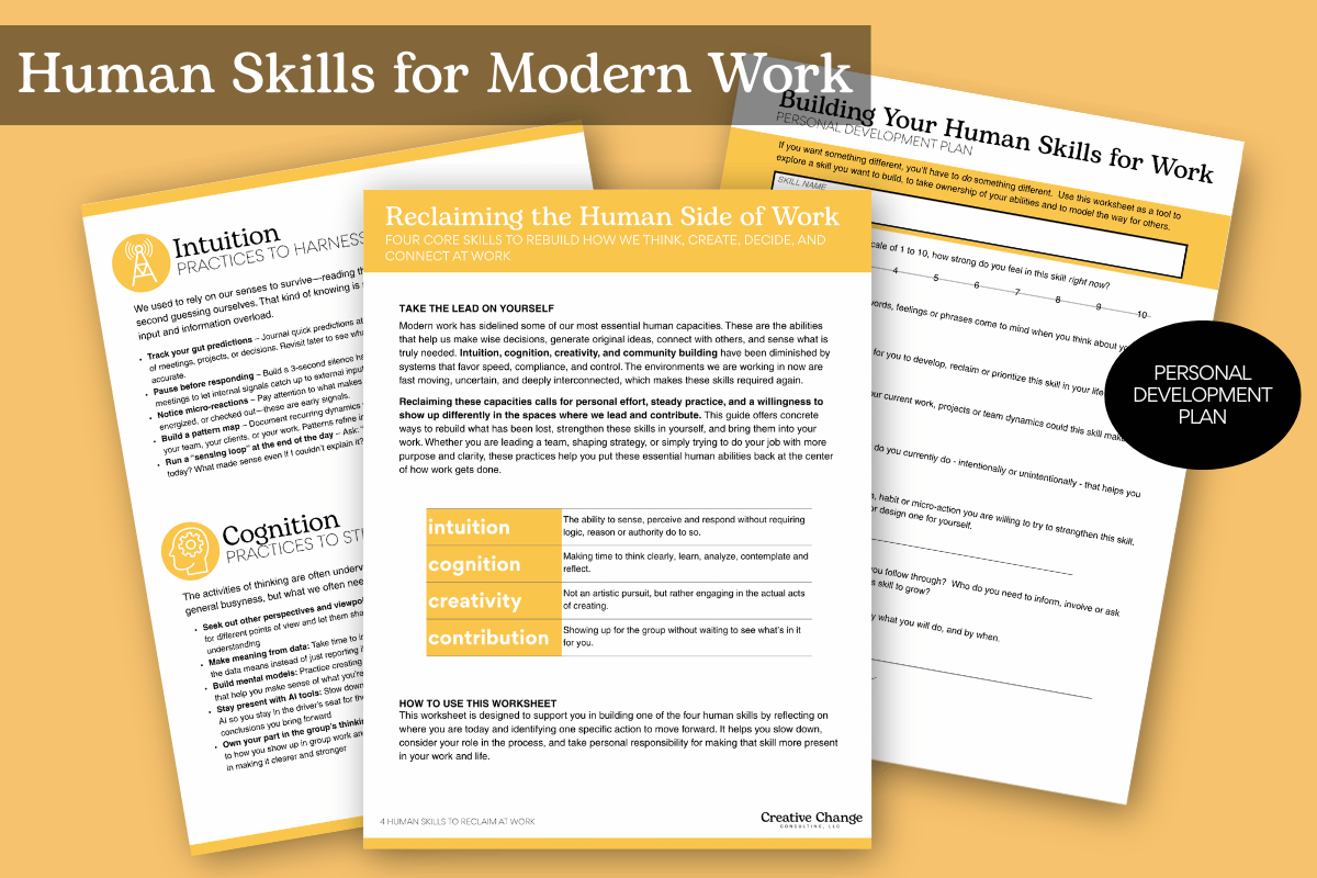 Today's work systems reward speed, reactivity, and constant output. In doing so, we overlook the capacities we may actually need to navigate complexity and take responsibility for the future we’re shaping. This guide is for you if you’ve noticed the limits of how work is designed and are ready to shift the way you engage with it. It focuses on four core skills - intuition, cognition, creativity and community contribution, and offers ways to begin practicing each one in your real, everyday work.